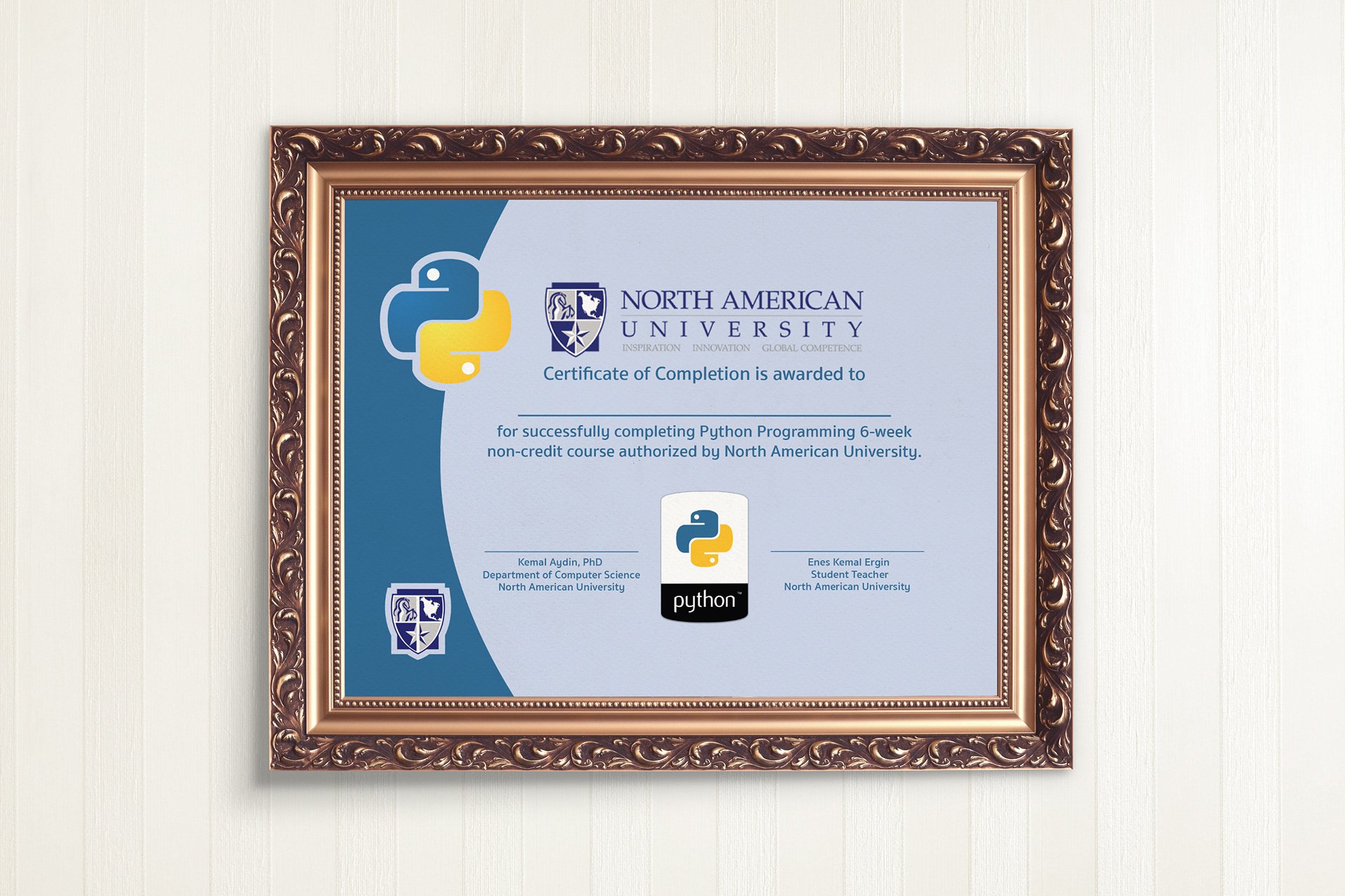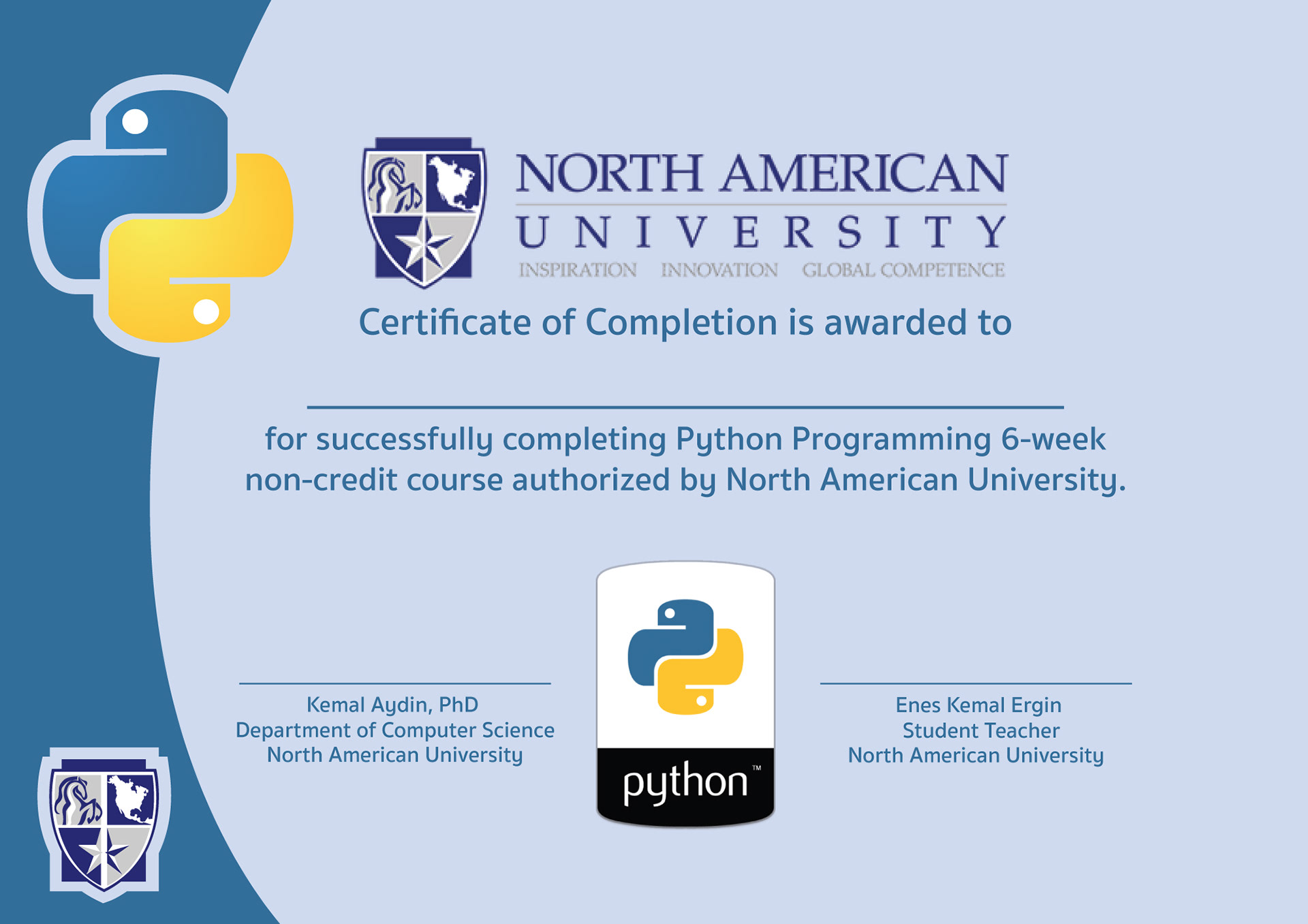 The Certificate that I made for North American University Computer Science department. Python course for students.